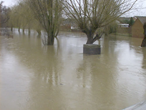 River Flit looking west, showing the submerged fencing adjacent to the children's play area (left), and the riverside properties under threat (right). The willow trees are normally "high and dry" on the banks of the river... |