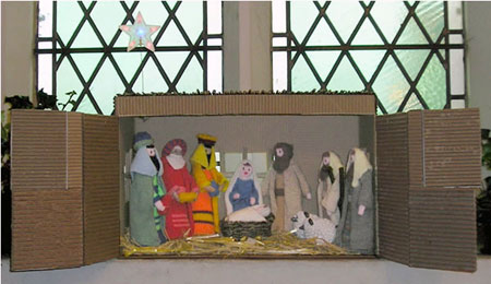 New CribA wonderfull new Crib has been built for us by Frank Bond. As always, Frank has paid enormous attention to detail including the provision of a multi-coloured LED star, an internal light and a hand-stitched willow twig roof. Teamed up with the exquisite knitted figures made for us by Maggie Pepper, the new crib is a wonderful way of illustrating the Christmas story, especially to young children - do try to bring them along to see it! Date 18th December 2004 |